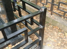 Изготавливаем вазу, наносим изображение. Перед памятником делаем небольшую площадку под траурную урну. Лавочка, установленная на участке, изготовлена полностью из металла. Торцы прямоугольных труб закрыты заглушками, которые надёжно защищают полости от проникновения влаги в период с осени до весны.