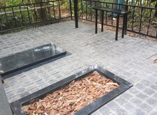 Переходим к завершающему этапу работы. Переустанавливаем уже стоящий памятник, немного его приподнимая, и закладываем территорию участка гранитной брусчаткой.