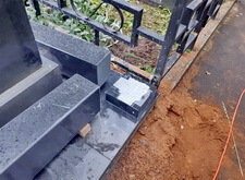 Привозим заранее изготовленное гранитное ограждение, согласованное с клиентом. На этапе монтажа цоколя зачищаем от полировки все соприкасающиеся поверхности и делаем на них засечки: это поможет клею лучше схватиться, тем самым продлевая срок службы ограждения. Балки мы приподнимаем за счёт специальных проставок. Такое решение очень удобно: в пятисантиметровые щели будет уходить скапливающийся на могиле мелкий мусор, во время дождя туда будет стекать вся влага, а при выполнении влажной уборки достаточно будет просто пролить территорию места захоронения необходимым количеством воды.
