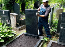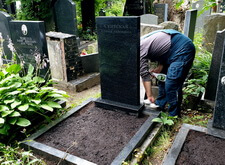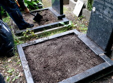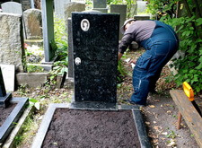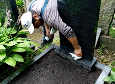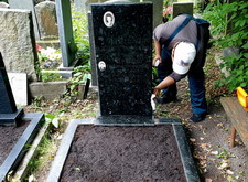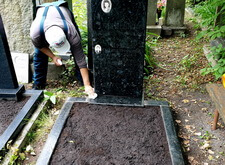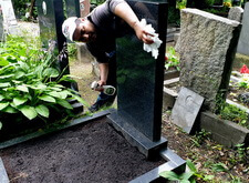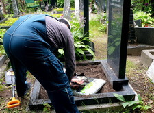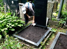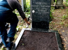 Сметаем с бортов цветника лишнюю землю, после чего переходим к самим надгробьям: вытираем памятники, немного проявляя надписи на их поверхности. Параллельно с этим протираем цветники, окончательно удаляя рассыпанную в процессе посадки землю.