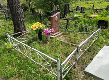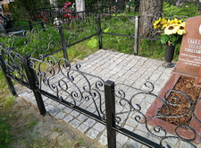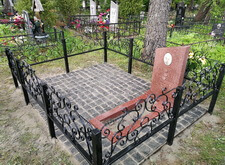 Так выглядело место захоронения на момент окончания работ: оградка заменена, памятник дополнен цветником и вазой, земля укрыта брусчаткой. Помимо этого, мы покрыли секции ограждения серебрянкой.